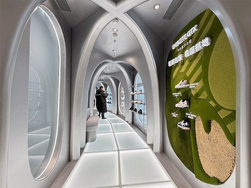 在高尔夫球空间二楼也有一道连廊,走过去是儿童空间,这道连廊主打的是太空科幻感设计。