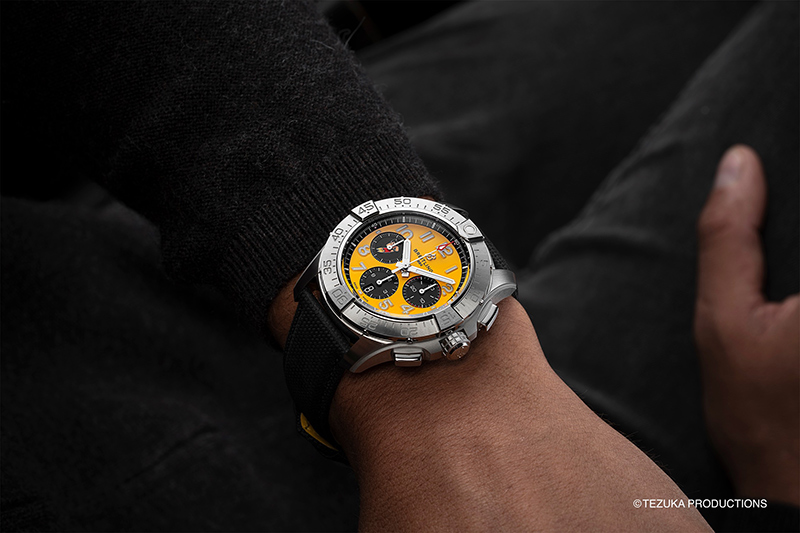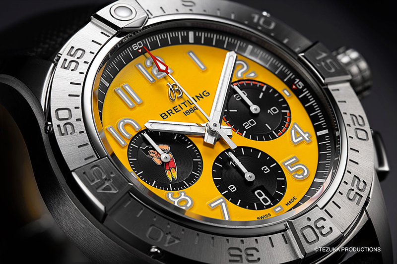 12 月 16 日,百年灵宣布推出铁臂阿童木联名限量腕表,腕表基于复仇者系列,并融入了各种铁臂阿童木元素,在亮黄色表盘上的基础上,9 点钟位置的小表盘有腾空跃起的铁臂阿童木形象,同时表背也出现了铁臂阿童木头像,他以更加俏皮的姿态和正面的形象形成反差。
