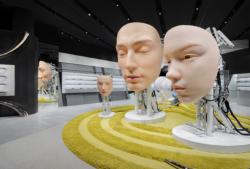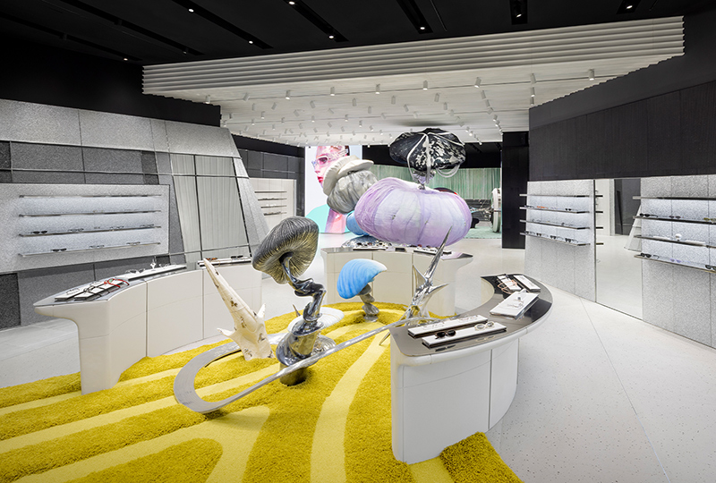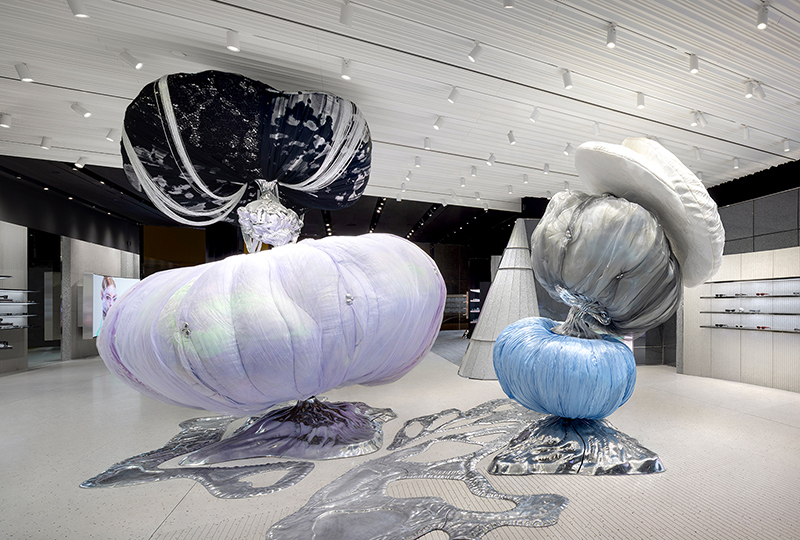 店铺打造延续了品牌一贯的风格和现代零售的概念,店内带来了三个“THE GIANT”动态装置,内部还有高耸的织物装置,整体营造出超现实主义的氛围。