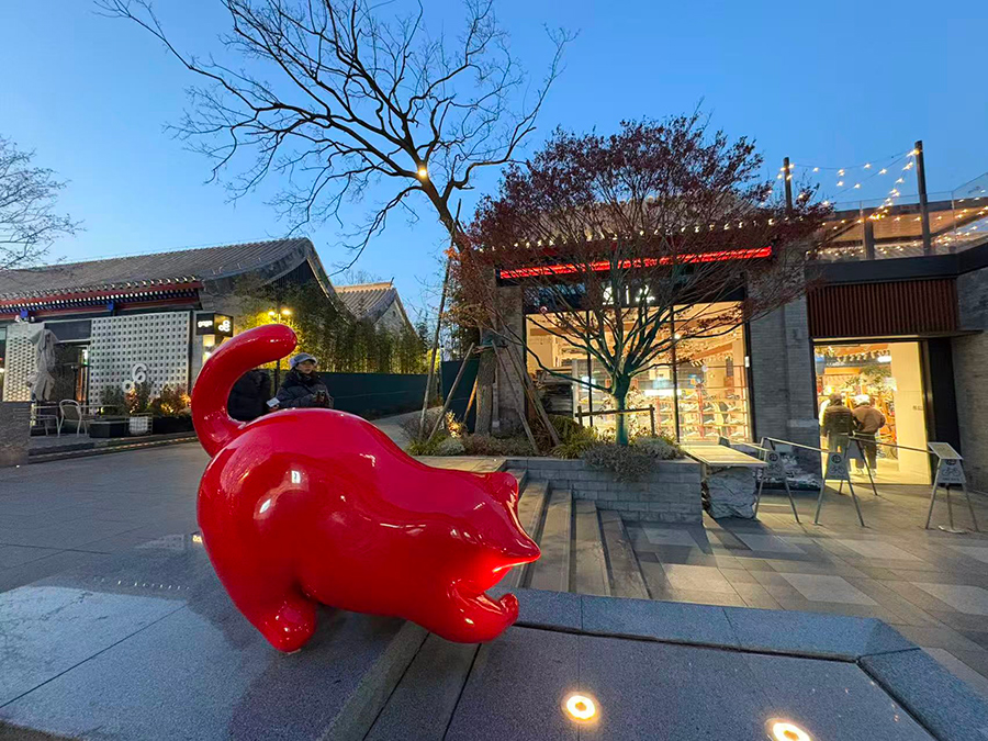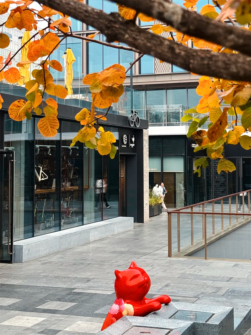 传统商业往往具有非常明确目的性的动线和清晰的边界。但在这里,空间是松弛的、可漫步的。店铺与绿植交织,餐厅与买手店像长在街巷里,偶尔出现的红色猫咪形象,像胡同里突然窜出的猫,带着熟悉的趣味。