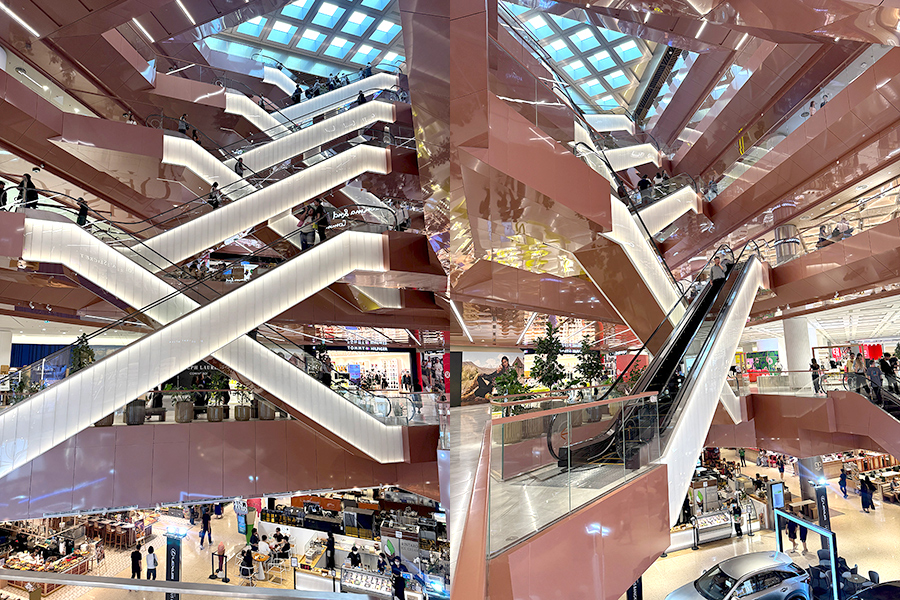 再往里走,建筑语言明显克制。整个室内只保留两个性格非常清楚的中庭。一个是银色金属构成的冷峻空间,线条硬朗;另一个是粉色调的柔软场景,更像社交舞台。动线干净、不绕路,让人不会被“商业迷宫”困住。我很喜欢这样的简洁,信息量适中,走起来轻松。