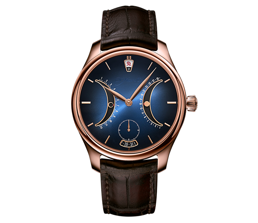 设计上,表盘左右两侧分别设有月牙形视窗,左侧指示农历月份,右侧则是同步显示农历日期和月相。12 点位置有一个视窗显示农历生肖,另一个视窗则是闰月显示——会在含有 13 个月的年份显示当年的置闰月份(不含闰月则呈现黑色),而 6 点位置则是小秒盘,下方为格里高利历(也就是公历)日期视窗。