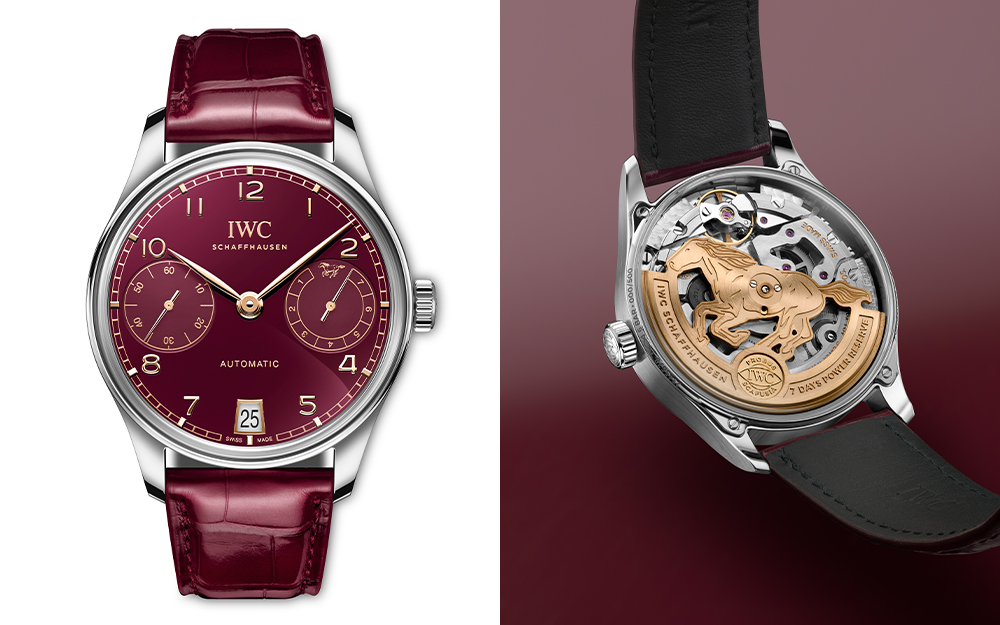 和往年一样,IWC 万国表依旧是最早发布马年主题腕表的品牌之一,这款主题腕表在 2025 年 10 月 14 日就推出了。今年 IWC 选择以葡萄牙系列自动腕表 42 为蓝本,和前几年相同,还是主打勃艮第红加金色细节的配色方案,这很有中国新年氛围,同时又经典日常。