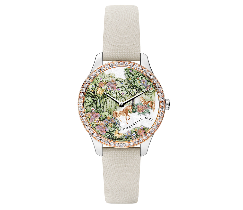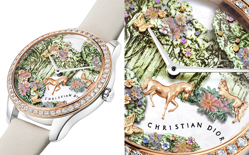 延续 Grand Soir 系列一贯的风格,DIOR 在 2025 年 12 月 23 日公布的马年特别款腕表在表盘上描画了骏马在花丛漫步的诗意画面。