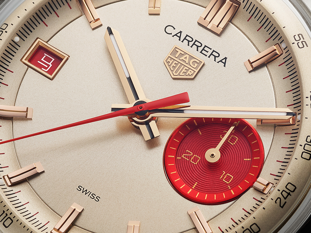 TAG Heuer 泰格豪雅选择在卡莱拉系列上诠释马年主题。这款卡莱拉马年计时码表在 2025 年 12 月 26 日亮相,它的灵感来自“火马”,在香槟金太阳纹磨砂表盘上,泰格豪雅用红色装点了“Azuré”分钟计时盘和日期视窗,中央指针也采用了红色漆面装饰。