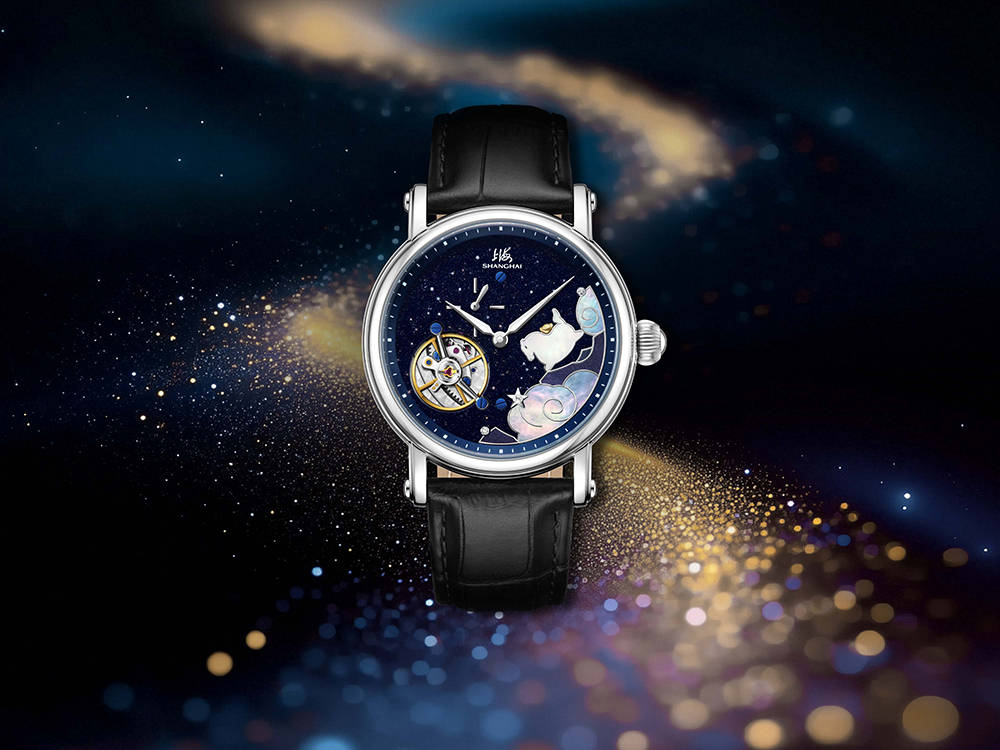另外上海表还带来了一款风格更加梦幻的 THE BUND·时迹马上有钱限量款。砂金石表盘上装饰了珍珠母贝打造的卷云和山峦,还有一匹圆润的小白马,白马还驮有足金打造的金元宝,满满的都是好寓意。
