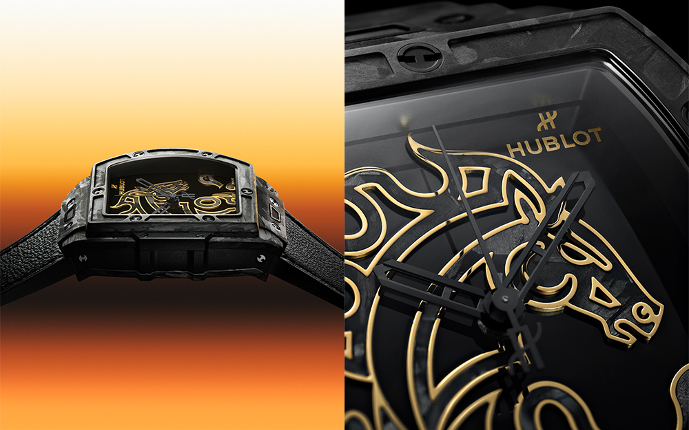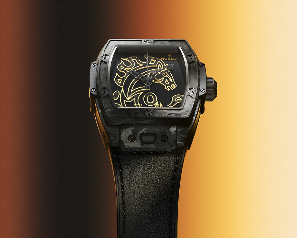 这款 Big Bang 灵魂丙午马年腕表的表盘设计灵感来自唐代艺术作品中的“五花马”——鬃毛被修剪成五瓣花形状,宇舶表利用碳纤维细工镶嵌工艺在表盘上手工铺叠出了骏马的造型,同时以镀 3N 金的黄铜镶贴出骏马的轮廓,这一立体金质线条的灵感则是取自中国古代朝服所采用的刺绣工艺,在现代摩登的外观下带有中式传统韵味。
