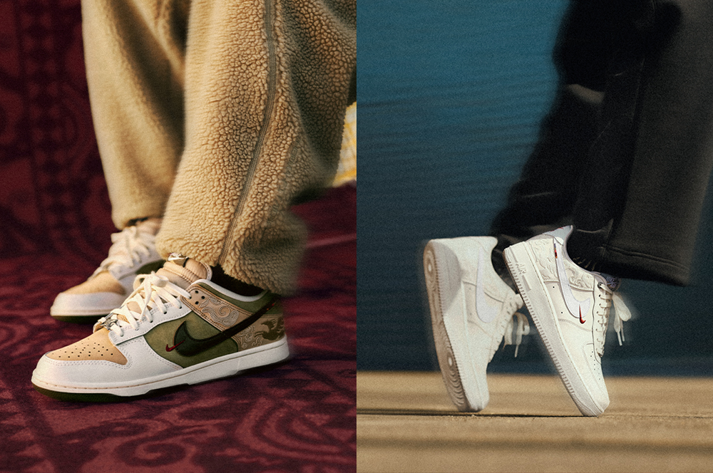 而更具潮流意味的 Dunk 和 Air Force 1 则是主打浮雕般的立体飞马祥云图案装饰,喜庆且好穿搭。