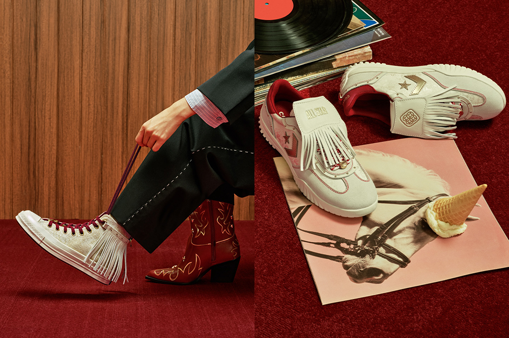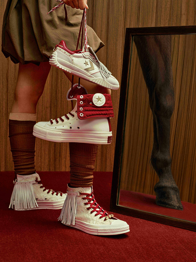 其中 Chuck 70 高帮的白色鞋面采用了具有缎面光泽的材质,并饰有中式纹样的提花,它配有可拆卸的后跟流苏装饰;流星德训鞋是在鞋舌部位增加了可拆卸的流苏片,除了扣马年主题,还有点复古足球鞋的味道;还有一款马靴版的 Chuck 厚底鞋,鞋帮是可折叠的设计,露出红色内衬也非常有趣。