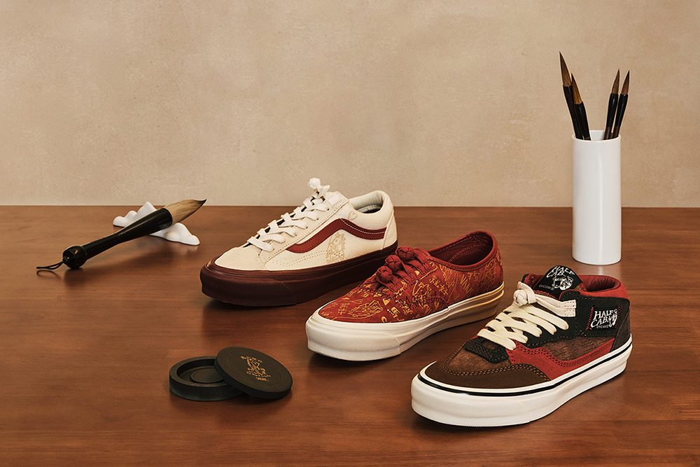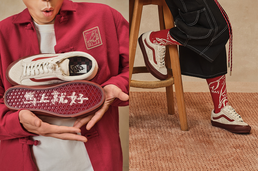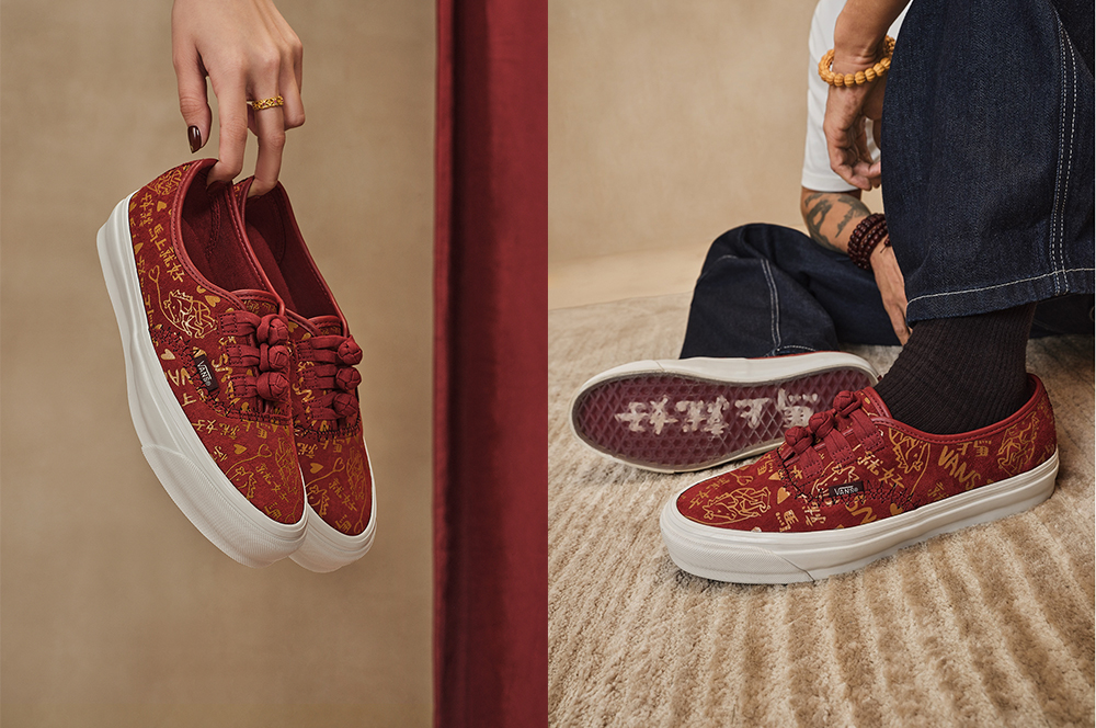 其中 LX Authentic 44 Knot 以红色为底,满铺 Bolin 创作的金色纹样,鞋带还换成了传统盘扣;LX Old Skool 36 采用了米色鞋身搭配酒红色外底的色彩组合,同时鞋面装饰有浅金色图案,鞋带也融入了盘扣设计。
