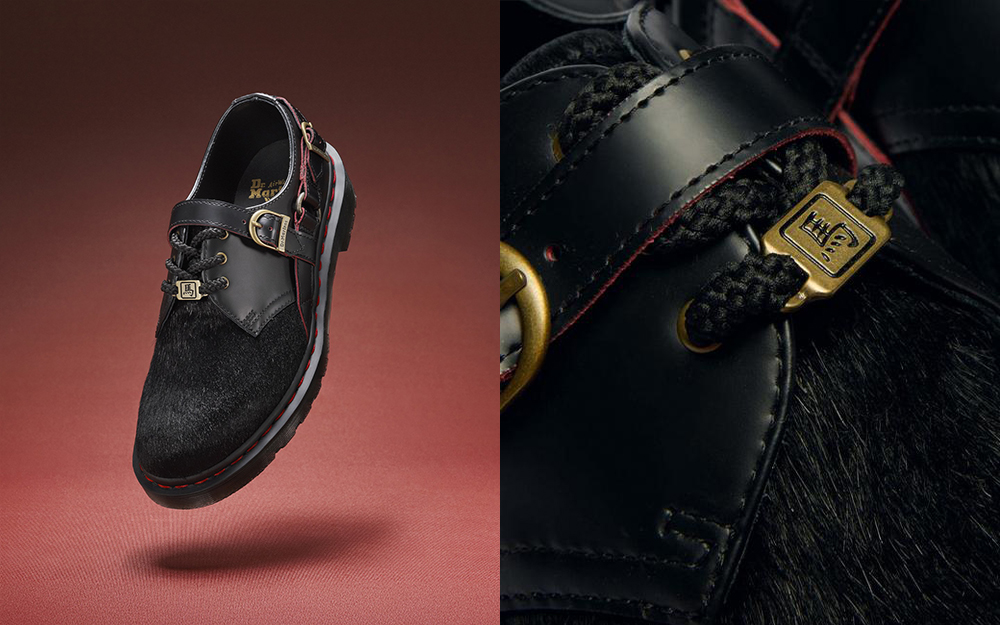 其中的 1460 八孔靴在鞋身上捆绑了缰绳风格绑带,后跟拼接了仿马毛质感的材质,同时由红色缝线替代了原本经典的黄色,再搭配复古金色五金配件,鞋带扣还饰有“马”字装饰,呼应中式传统。