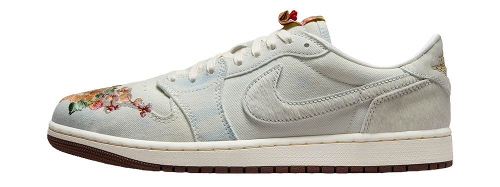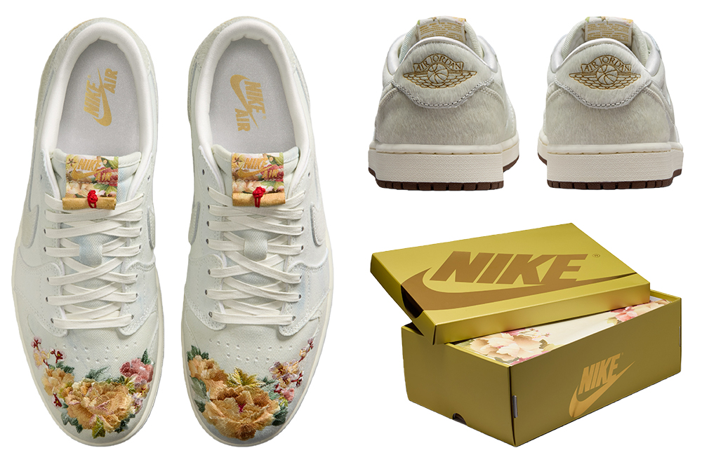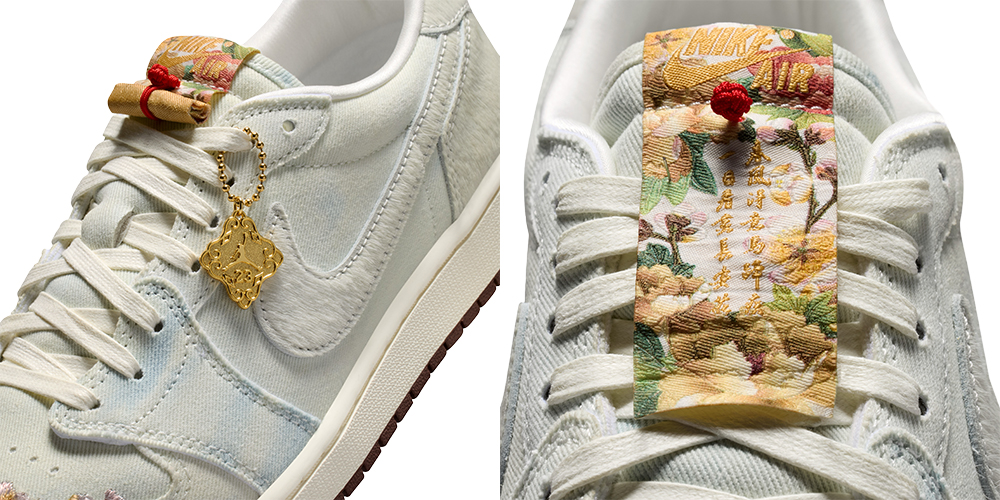 其中 Air Jordan 1“苏绣”成为了重头戏,它的灵感来自孟郊的《登科后》,设计上以单宁加仿马毛材质打造鞋面(挺意外的组合),呈现出典雅又潮流的气质,此外它的鞋头装饰了苏绣工艺打造的繁花图案,鞋舌做成了可以打开的卷轴造型,后跟有金色镭射飞翼标志,另外还配备了马年主题的金属吊牌,整体和细节都很抢眼。