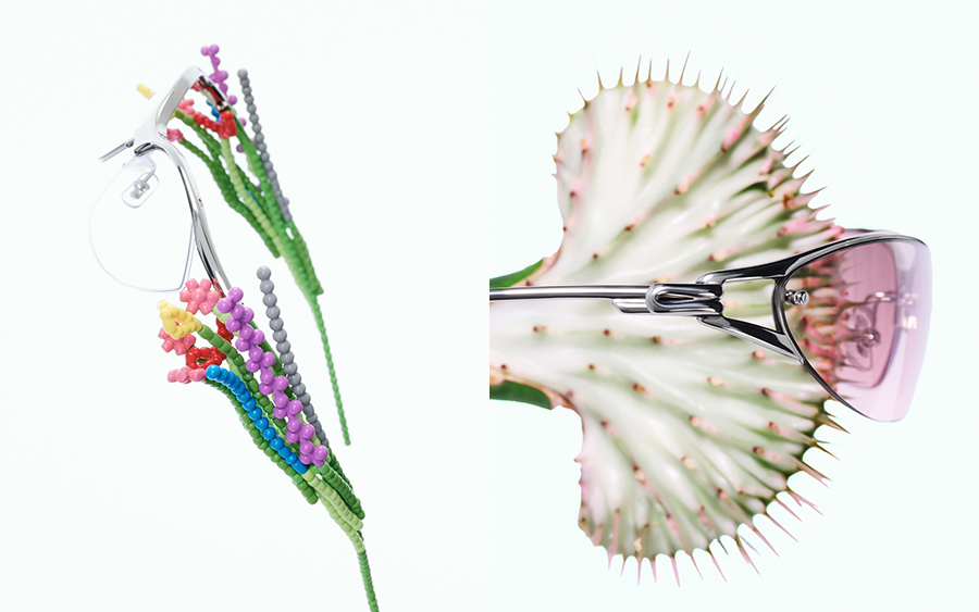 这次 GENTLE MONSTER 的 2026 BOUQUET 系列以植物茎干的构造为灵感,通过从植物结构中提取视觉元素来构建出独特的产品设计,其中主打单品由珠饰编织成了眼镜腿,而其它眼镜设计也演绎了缠绕、交错、绳结这些系列的标志性视觉语言,它们兼具了柔美的视觉效果和极具张力的表现,也有着对自然的致敬和诠释。