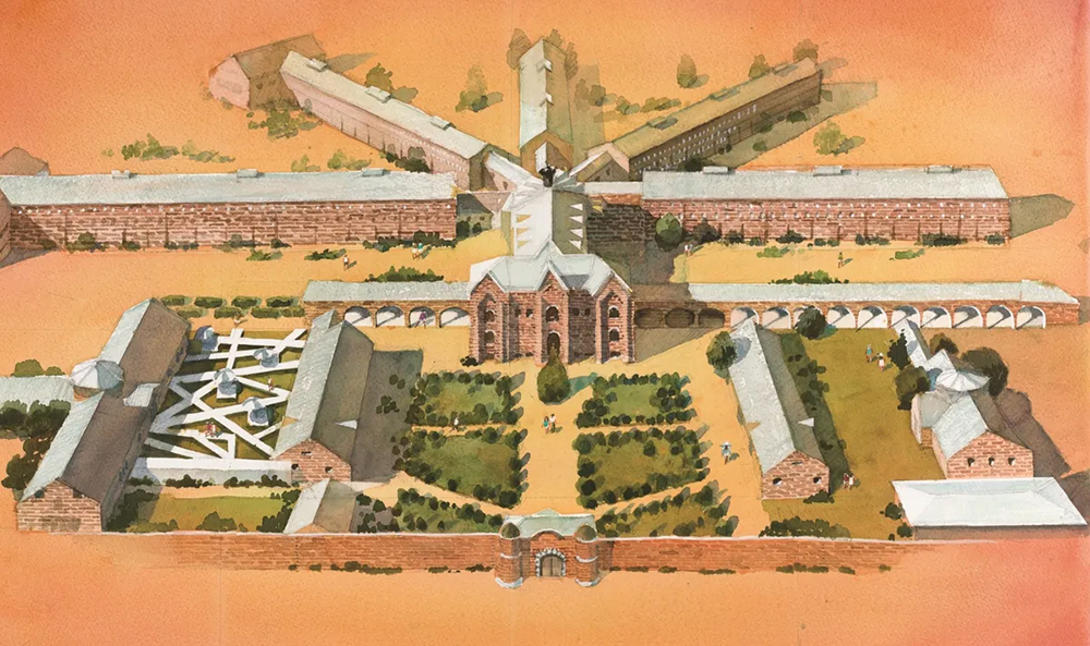 多说两句:这种放射状的建筑排布是哈维兰监狱系统(Haviland System)标志性的设计之一,这套系统由建筑师约翰·哈维兰(John Haviland)在 19 世纪初定义,最早用在 1829 年 10 月 25 日启用的位于宾夕法尼亚州费城的美国东州教养所的设计上,这被认为是世界上第一个真正意义上的现代监狱。