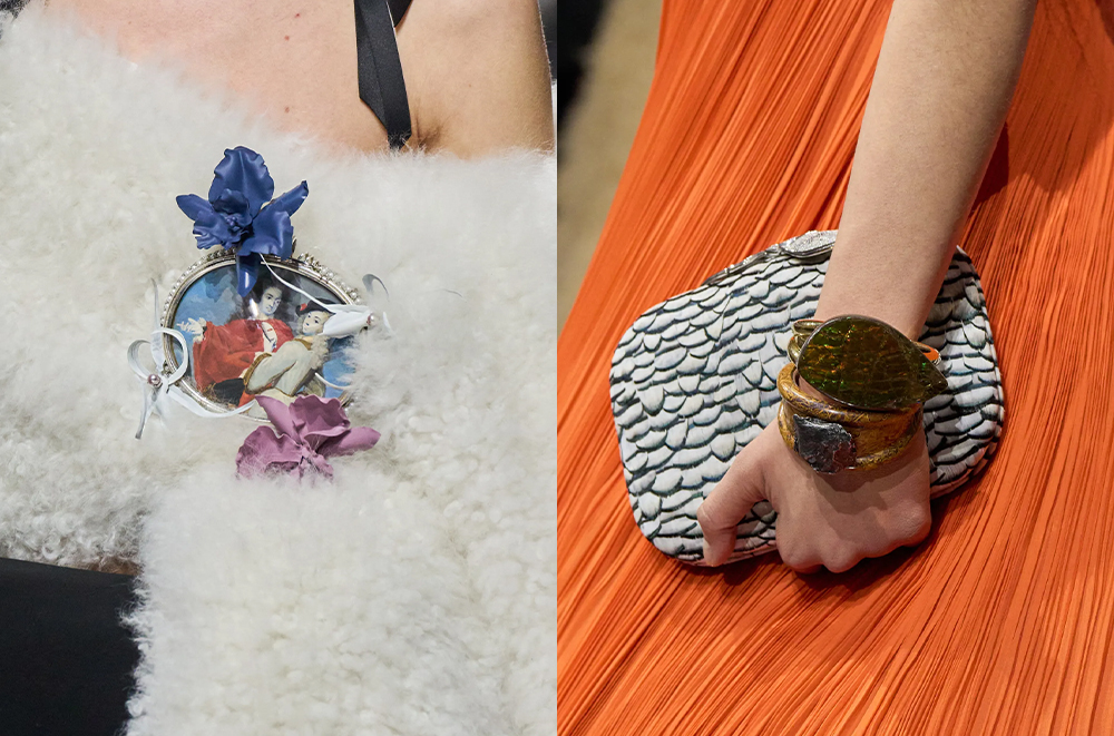 稀缺的、独一无二的原材料成为 Jonathan Anderson 首先尝试的:用 18 世纪法国古董面料辅以重工装饰来制作手袋或鞋履,把 18 世纪艺术家罗莎芭·卡里拉(Rosalba Carriera)和约翰·斯马特(John Smart)绘制的微缩圆章肖像用于制作胸针,再或是将陨石碎片这样独特的材料制作成宽幅臂镯和戒指。