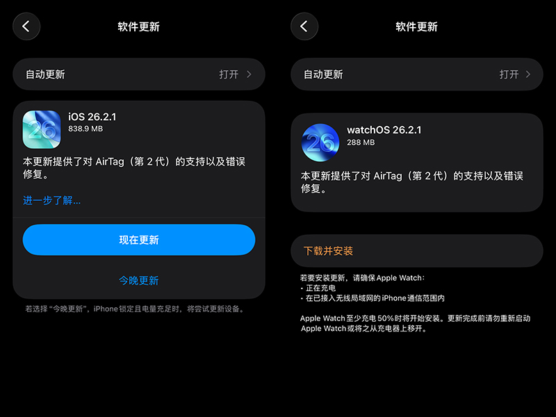 1 月 27 日,苹果推送了 iOS 26.2.1、iPadOS 26.2.1、watchOS 26.2.1 系统版本更新,同时 iOS 和 iPadOS 多个版本的老版系统也得以更新。