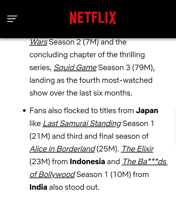 《弥留之国的爱丽丝》第三季在 2025 年 9 月 25 日上线,它的观看次数超过 2500 万次,但本季也收获了大量差评。作为被看作对标《鱿鱼游戏》的剧集,《弥留之国的爱丽丝》虽然仍是 Netflix 上非英语剧集里相当成功的,但在很多观众看来并没有达到预期的高度。