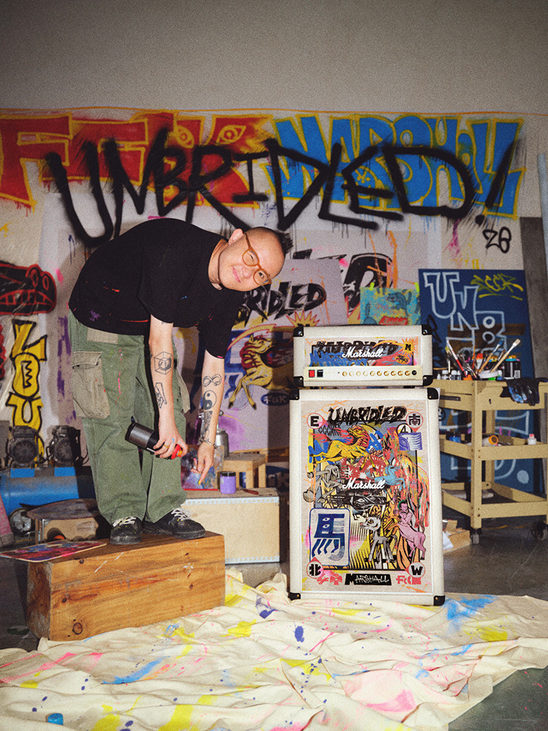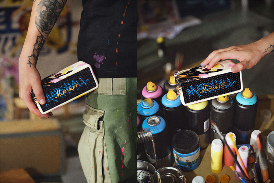 今年 Marshall 是和成都先锋艺术家 FCCK 合作,后者操刀了今年的主视觉,一幅“脱缰野马”融合摇滚世界元素,整个画面自由又无畏,展现了“理性的胡来”的创意概念,这一结合了插画、字体和图形纹样的组合也直接用在了 Emberton III 和 Studio 900 箱头与箱体上。