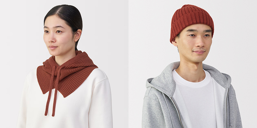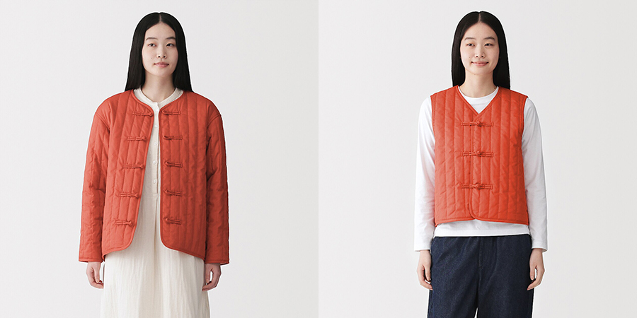 服饰里除了羊绒的圆领毛衣、套头卫衣、帽子和披肩,以及美利奴羊毛混的巴拉法克帽和编织帽,还有盘扣的棉服背心和夹克——今年盘扣设计大火,MUJI 也为大家带来了新选择。