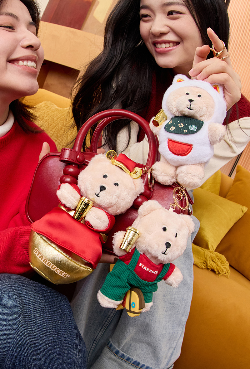 此外周边商品也很有卖相,熊店长挂件星礼包有了新春特别版,星礼卡有了经典金卡造型,以及接下来星巴克还有个活动:2 月 9 - 15 日在指定门店线下或通过“啡快”点单,单笔正价买两杯大杯及以上杯型新春限定饮品,就有机会得到一枚含 1mg 足金的“星巴克金运黄金贴”。