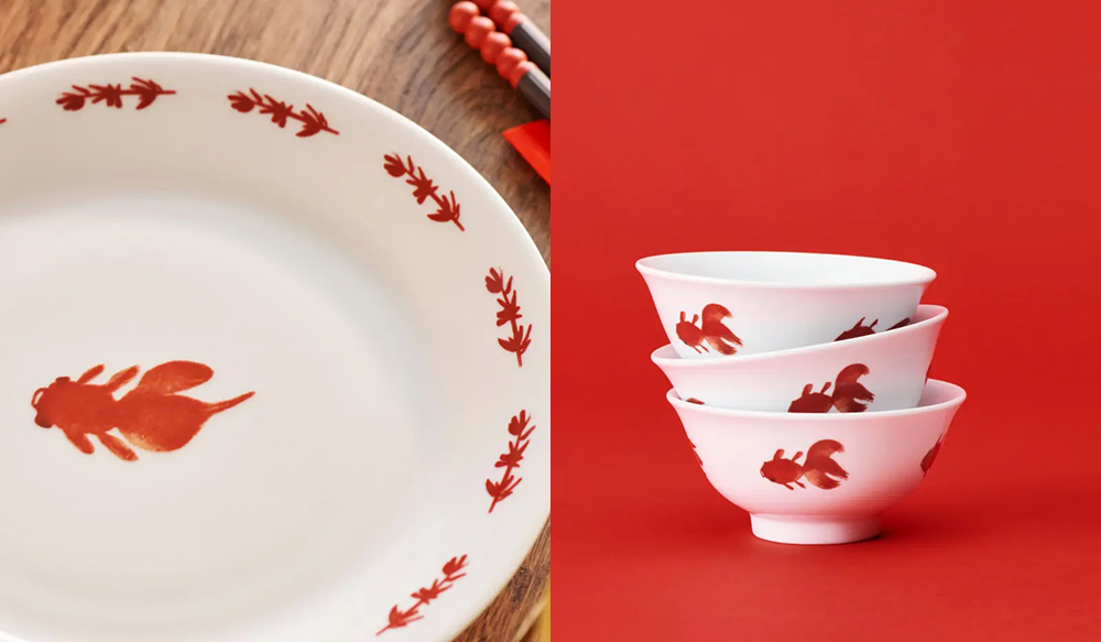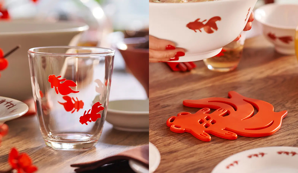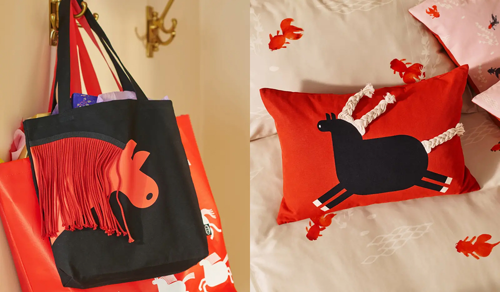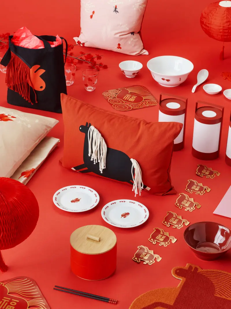系列有约 25 款新品,设计有两大主题,一是以生肖马为核心,圆润的胖马搭配纤细的四肢,有趣且喜庆,这一形象用在了门垫、靠垫套、窗饰、蜡烛托等装饰类产品上,另一个形象是金鱼——在中国传统艺术里金鱼寓意着富贵与繁荣,这一形象点缀在了餐具、床品与灯具上,寓意“年年有余”。