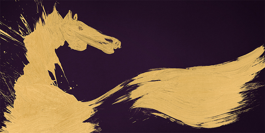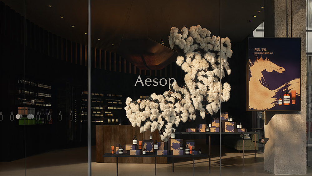 最后看看 Aesop 的。首先 Aesop 联动中国书法艺术家潘微带来了主视觉,这是一匹动感十足的金色骏马,它已经从 1 月 5 日开始以不同的形式出现在了 Aesop 的各个线下店铺里,这套视觉将持续用到 2 月 27 日。