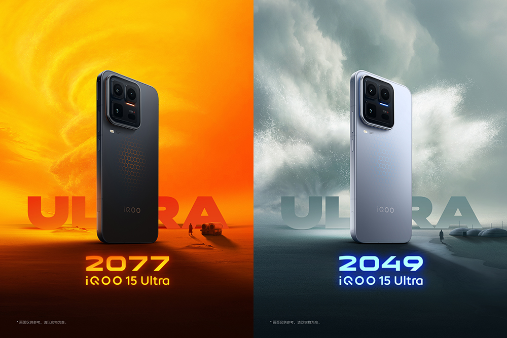 外观上,iQOO 15 Ultra 有 2077(黑)、2049(银)两款配色,它们有着透明未来舱 Deco 设计,并搭配 Monster Halo 呼吸灯和“Ultra”标识。这也考虑到了功能,冰穹风冷散热系统的进风口隐藏在了 Deco 下侧,兼顾了隐蔽性与防尘效果。