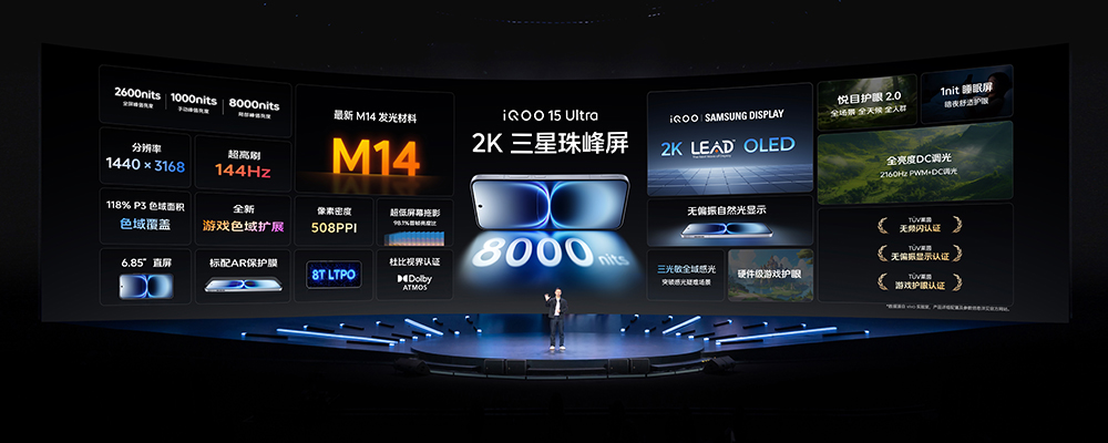 硬件配置方面,iQOO 15 Ultra 配备了 2K 三星珠峰屏,它支持了 2K LEAD OLED 技术,并采用 M14 发光材料,带来了 8000 尼特最高亮度和 1-144Hz 动态刷新率,也通过了杜比视界认证。它有着出色的游戏动态清晰度,画面移动无拖影,屏幕功耗也低于行业主流旗舰的 1.5K 屏,实现了体验与功耗的平衡。
