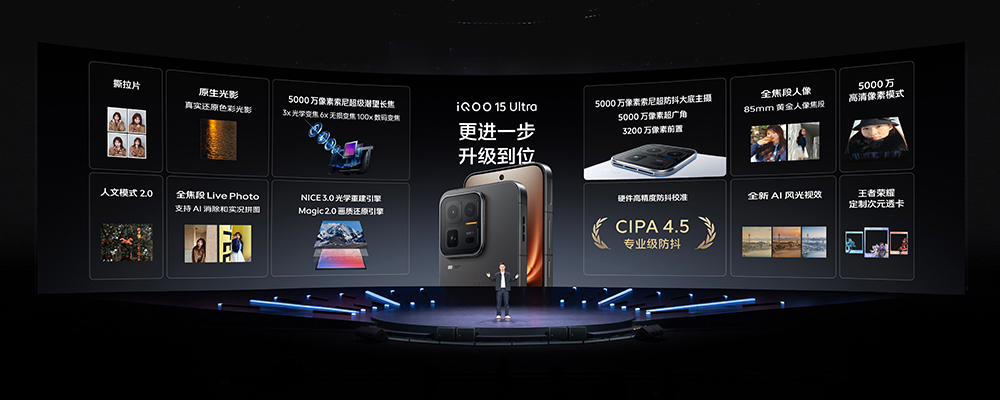 其它方面,iQOO 15 Ultra 这次有 3200 万像素前置镜头,后置是主摄、超广角和潜望长焦的 5000 万像素三摄组合,其中主摄和潜望长焦都支持了 CIPA 4.5 级防抖,也有 vivo 最新的 NICE 3.0 影像算法和 Magic2.0 画质还原引擎,用户可以用上原生光影、撕拉片风格滤镜、AI 风光大师等新增功能,带来更大的可玩性。
