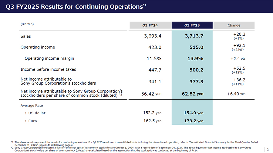 2 月 5 日,索尼公布了 2025 财年第三季度(自然月是 2025 年 10 月 1 日到 12 月 31 日)的业绩,本季索尼集团实现销售收入 37137 亿日元,同比增长 1%;营业利润 5150 亿日元,同比增长 22%;营业利润率为 13.9%,同比增长 2.4%;净利润 3773 亿日元,同比增长 11%。