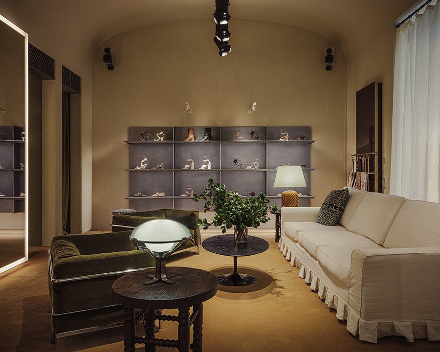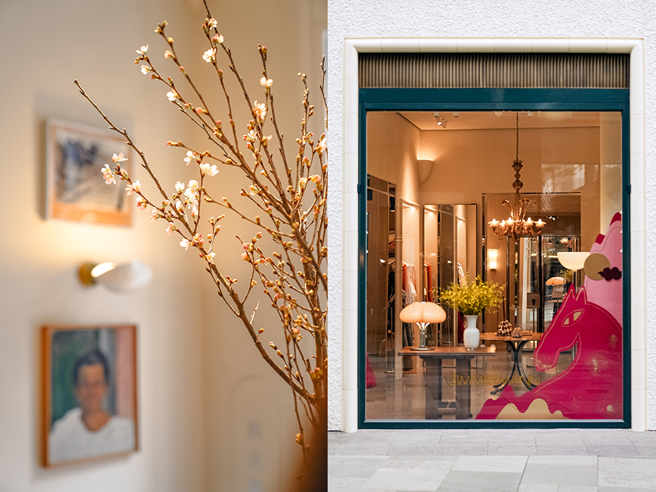 店铺延续了 ZIMMERMANN 和长期合作伙伴、base 悉尼的建筑与室内设计工作室 McQualter 合作带来的设计语言,店内有定制水磨石、本地烧制的陶瓷砖以及复古家具的组合,呈现出柔和温暖的氛围。同时正值春节期间,店铺也带来了融合了马纹元素与流动的金色线条的新年限定橱窗设计。