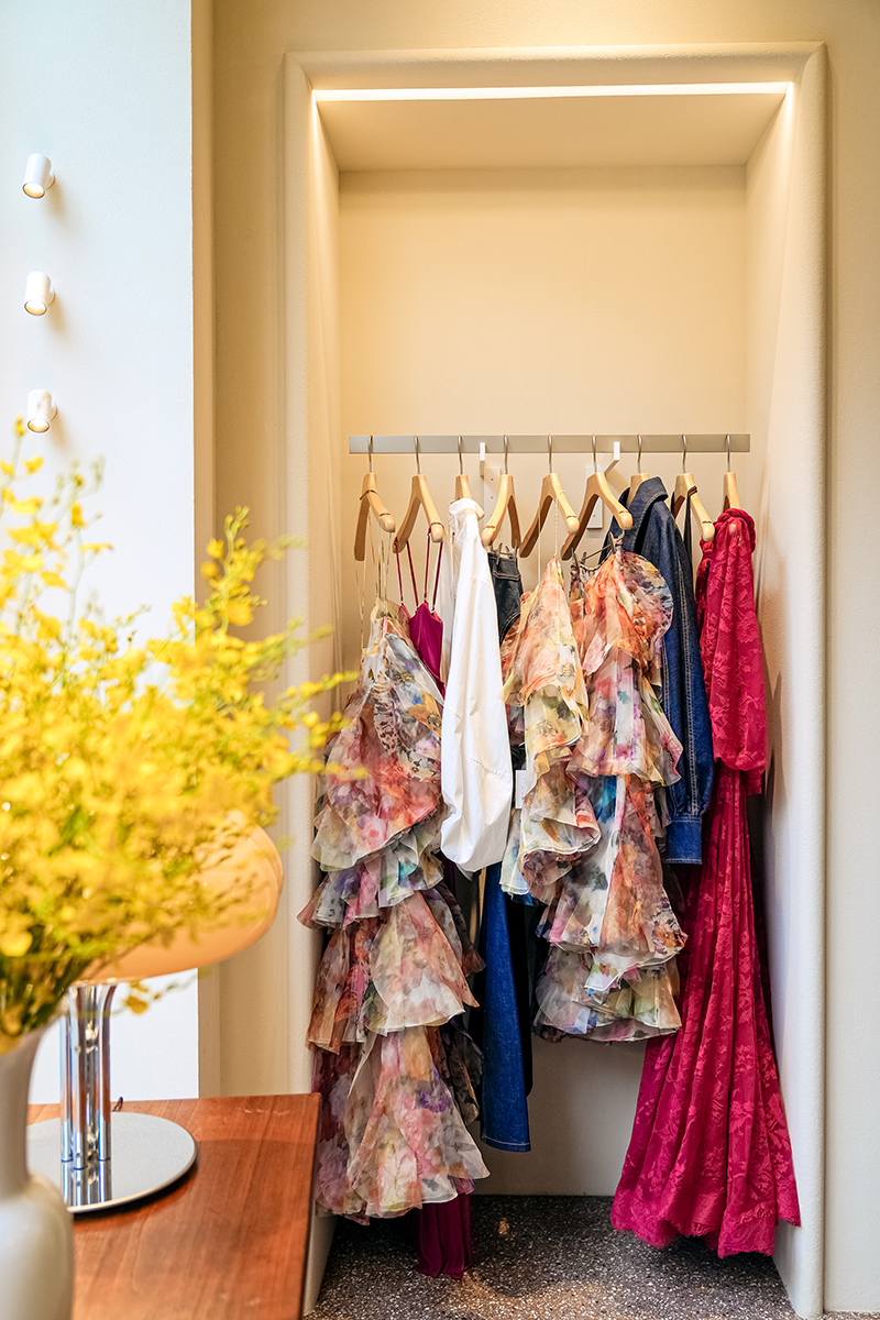 目前在店内能看到 ZIMMERMANN 全线的服装、鞋履、饰品和眼镜等品类,同时 ZIMMERMANN 2026 春季成衣系列“灵犀艺境”也在店内带来,系列从上世纪 70 年代的艺术社群中汲取灵感,以蓬勃灵动的廓形承载了迷幻艺术花卉、扎染印花的应用,以大胆的色彩碰撞带来无拘无束的精神和表达。