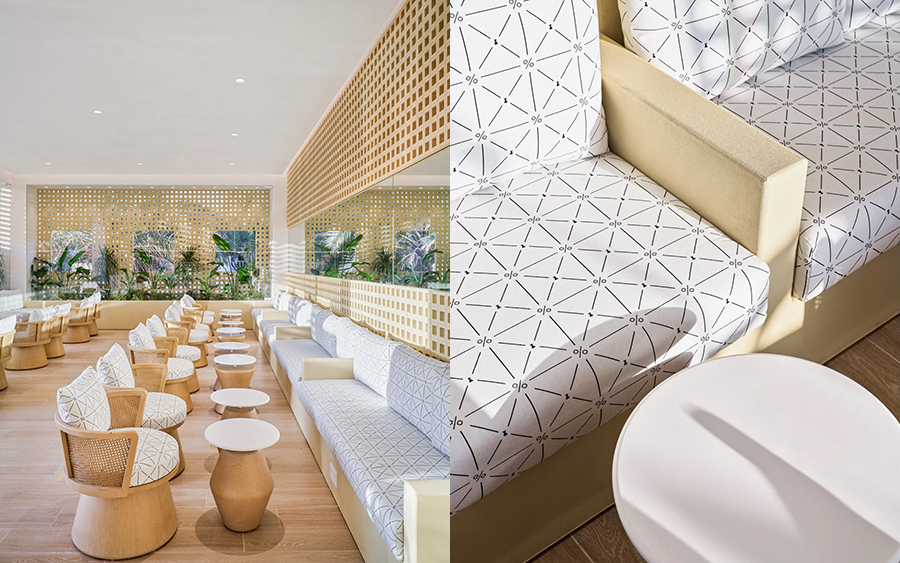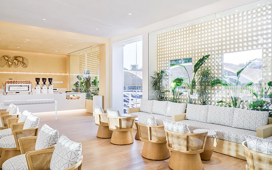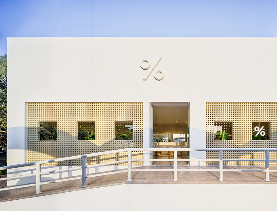 店铺有大面积落地玻璃的应用,同时考虑到科威特全年都是大太阳,店铺采用了 cobogó 元素(一种空心墙的传统设计)来和玻璃、绿植组合,避免阳光直射,同时又能将自然光引入室内,且保持了通风以及隐私性。