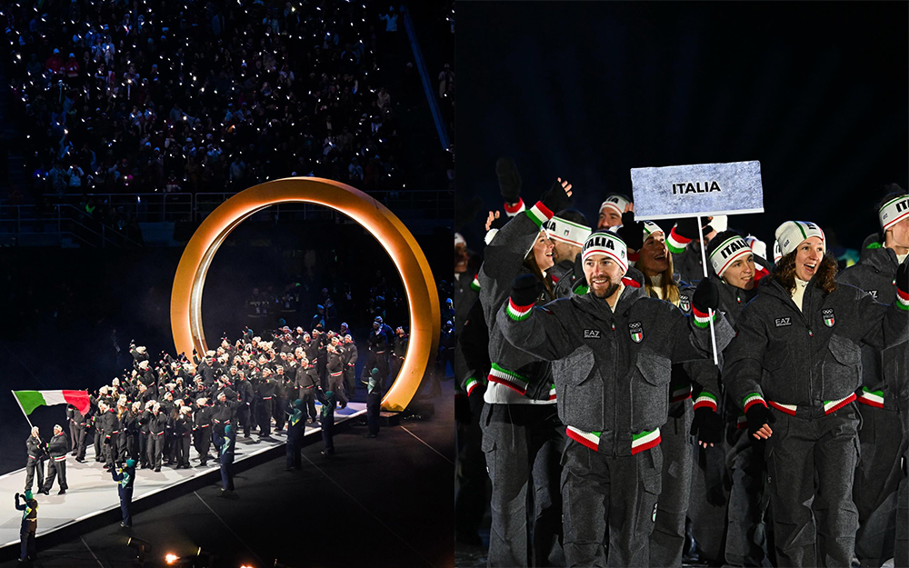 EA7 这次为意大利代表团打造的开幕式服装是一套灰色混纺羊毛斜纹布套装,外套是一件飞行员夹克,衣身下摆、袖口及帽子内衬加入了意大利国旗的三色装饰,背后还有“Italia”字样。
