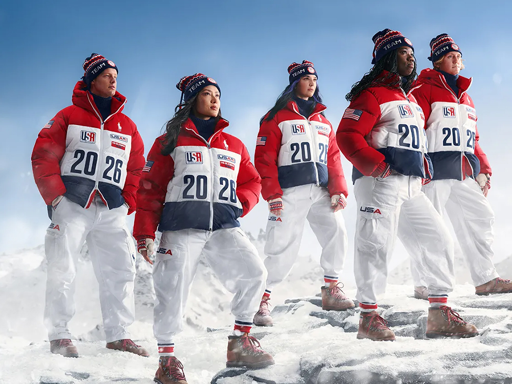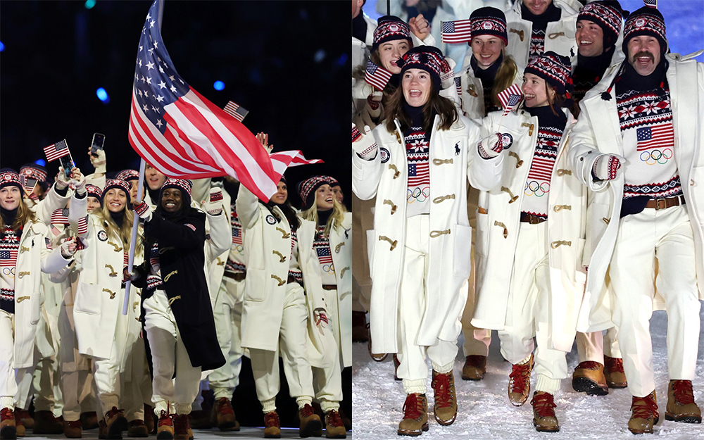 美国代表团的开闭幕式服装由合作近 20 年的 Ralph Lauren 打造,延续品牌过去对于奥运穿搭的理解,开幕式服装会偏正式一些,白色羊角扣大衣搭配了高领毛衣和羊毛长裤,针织帽子、手套都采用了毛衣同款花纹装饰,在搭上一双配有红色鞋带的棕色麂皮登山靴,非常美式。