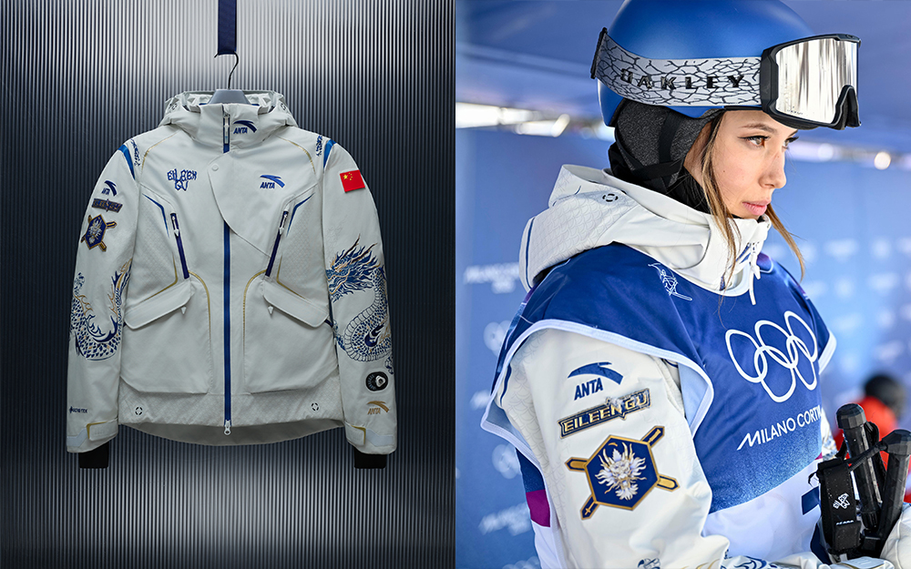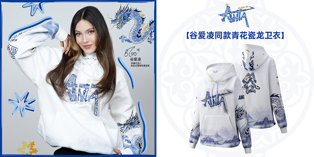 另一边,安踏赞助了 10 支国家队的比赛装备。虽然多数冬奥项目的比赛服并不适合日常场合,但安踏也还是专门带来了旗下代言人谷爱凌战袍的衍生卫衣。它和比赛服一样都主打青花瓷设计,同时延续了和上一届相同的龙纹元素。