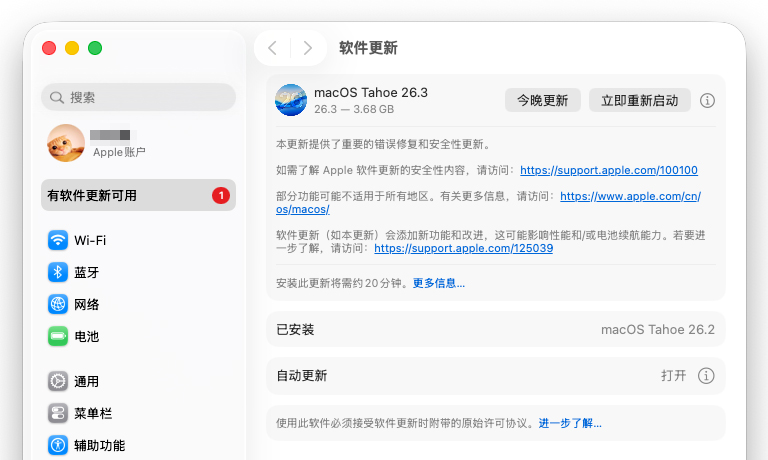 2 月 12 日,苹果推送了 iOS 26.3、iPadOS 26.3、macOS 26.3、tvOS 26.3、visionOS 26.3 和 watchOS 26.3 版本更新,这次是错误修复和安全性更新。