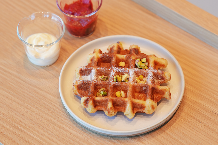 随着新店开幕,蓝瓶同步带来了两款新品,其中关山樱花拿铁以门店手工制作的关山樱花风味糖浆融入经典拿铁,表面再点缀上巧克力碎,它售价 48 元;还有草莓华夫,它以蓝瓶经典的列日华夫覆上应季草莓果酱,并加上了奶油奶酪,它售价 45 元。