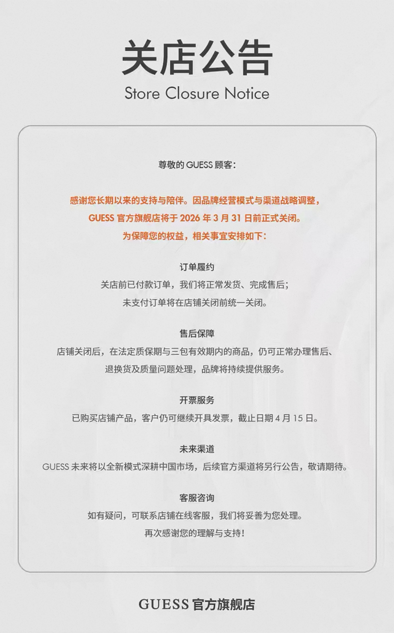 2 月 27 日,GUESS 在天猫旗舰店上发布了关店公告,宣布“因品牌经营模式与渠道战略调整”,GUESS 官方旗舰店会在 3 月 31 日前关闭,在此之前购买的订单会继续享受售后服务,开票服务会持续到 4 月 15 日。