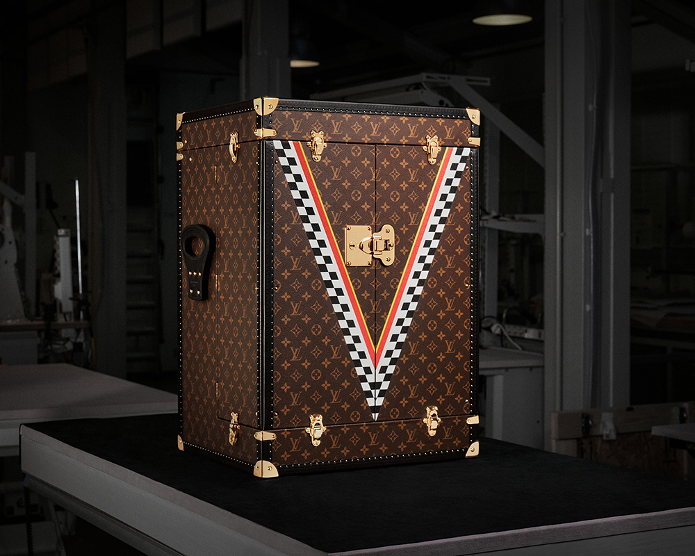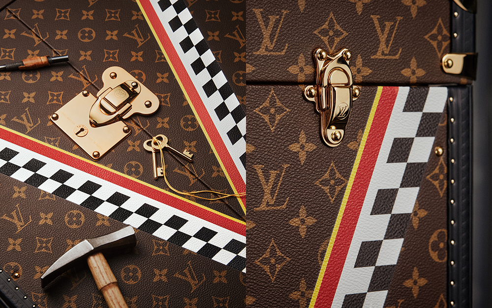 对于这次 F1 中国大奖赛,LV 打造了上海赛道标识及定制奖杯箱,前者会出现在赛道上,去到现场的同学可以留意,奖杯箱则延续了传统,箱子整体覆盖 Monogram 标识,同时有大大的 V 字图案——有“胜利”(Victory)和 LV(Vuitton)的双重含义。而红黄配色代表上海,再加上了象征赛道和终点线的黑白棋盘格。