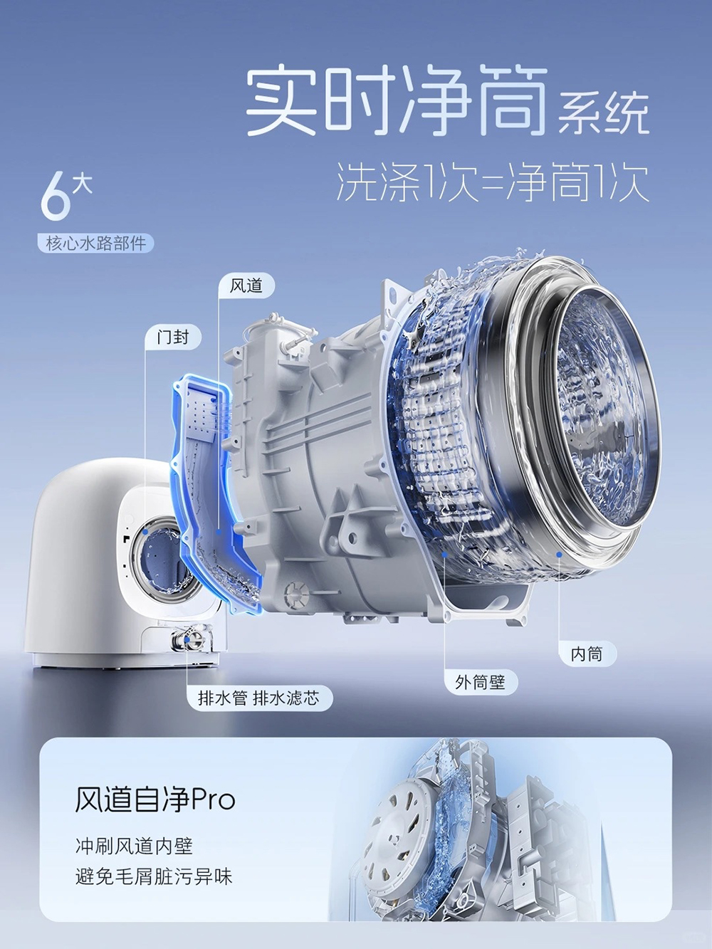M1S Ultra 也把自清洁当成了头等大事,采用石头实时净筒系统,成为业内首款做到实时净筒的“小洗衣机”产品。洗涤一次就等于净筒了一次,下次用的时候,不用担心衣服被二次污染。