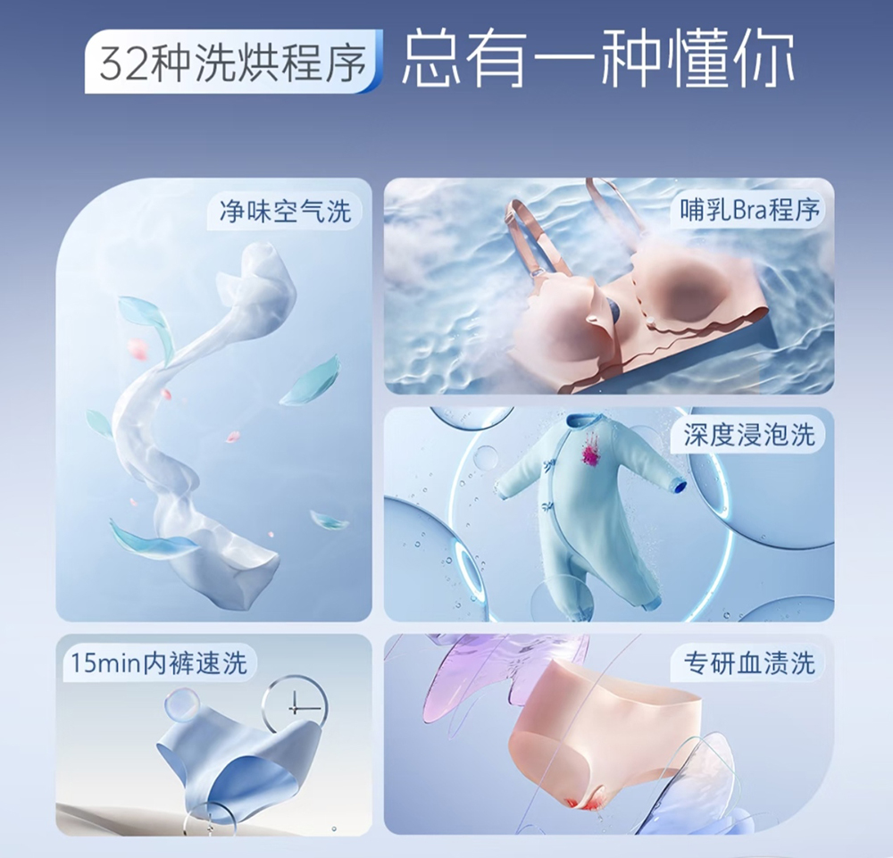 而且,它提供 32 种洗护程序,听起来很多,但每个都对得上一个真实场景:哺乳 Bra 洗、尿便渍洗、血渍洗、内裤速洗……不是功能堆砌,是真的有人需要这些。