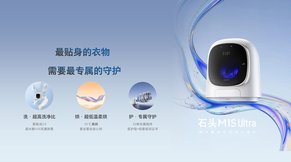 M1S Ultra(全称是“石头超水解迷你洗烘一体机 M1S Ultra”)做的就是把这些“麻烦事”一个一个拎出来解决。