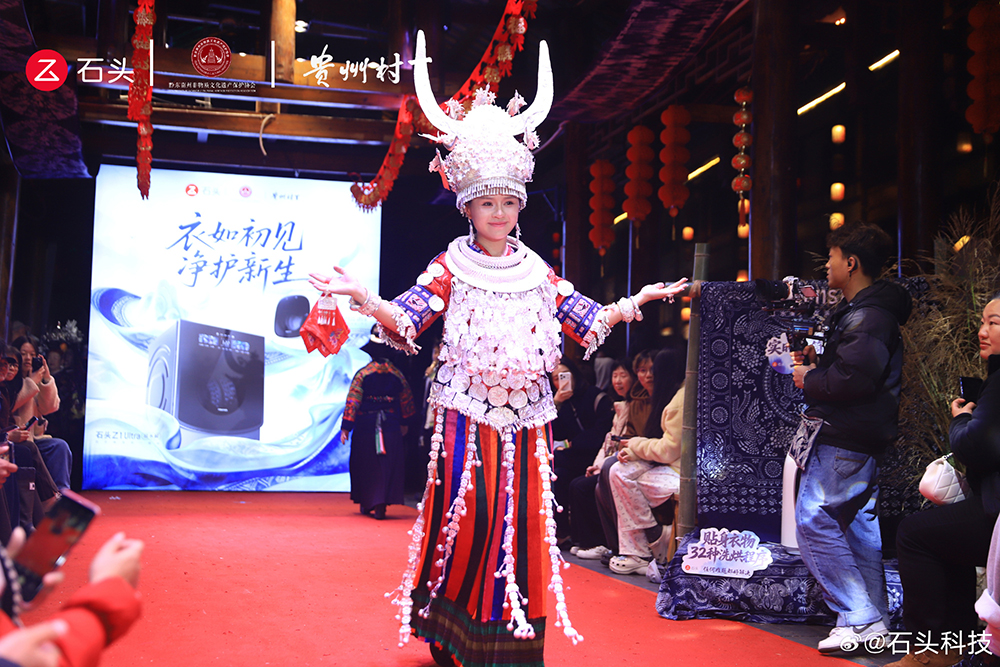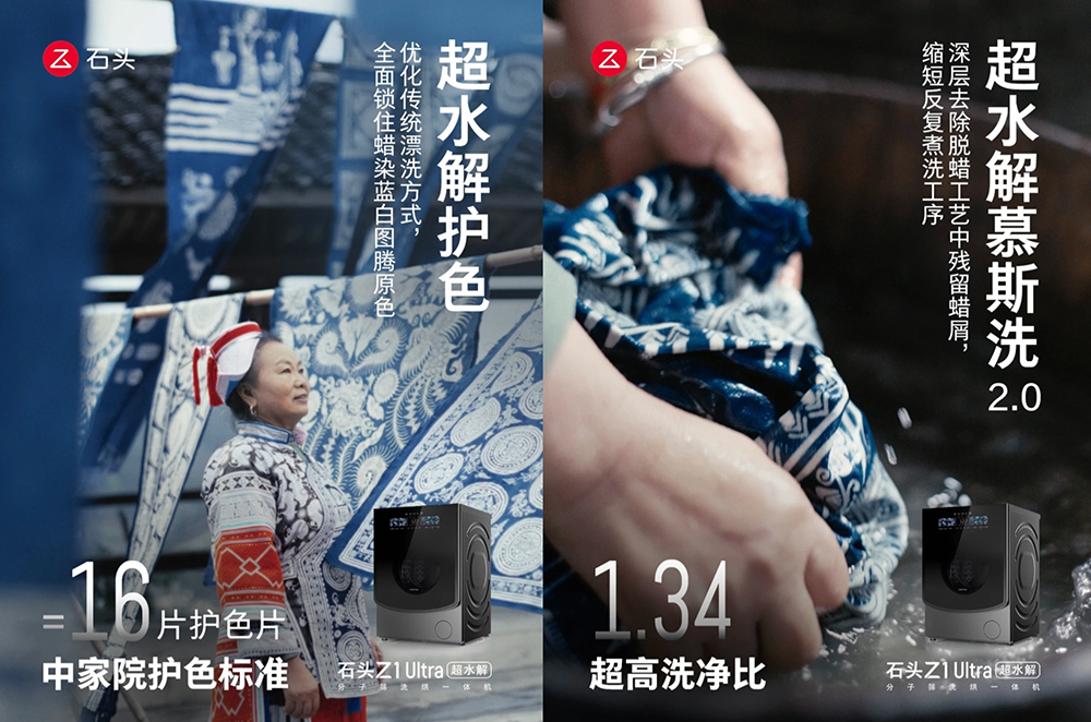 石头洗衣机携手黔东南州非物质文化遗产保护协会,联合发起非遗守护计划的同时,也带来了一场极具魄力的跨界挑战,一件件珍贵的非遗蜡染放进石头洗衣机内,最终不仅完好无损,甚至蜡染图腾也更加光彩焕然。以“超水解力”守护非遗之美的同时,这些非遗蜡染也在贵州村 T 大秀上大放光彩。