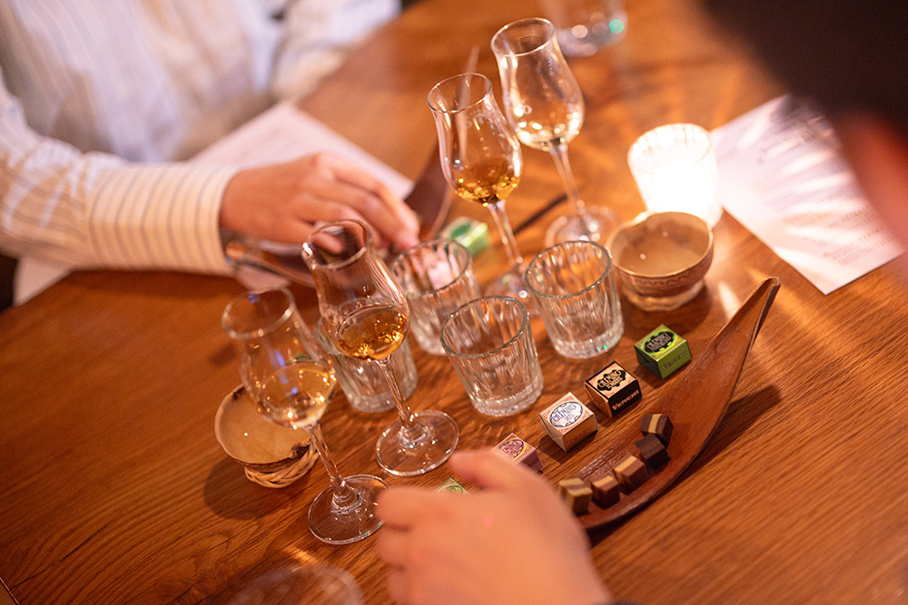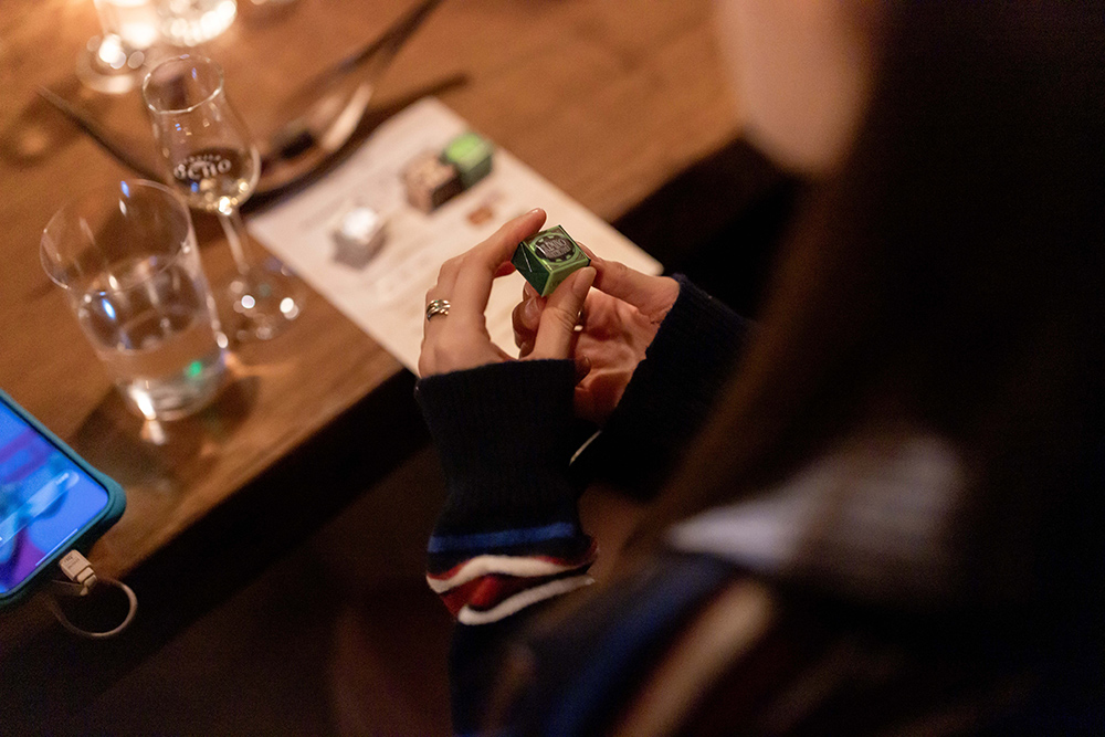 其实往往在吃正餐时,我们会特别注重 Wine Pairing、Tea Pairing 等,食与饮互相成就,味觉体验方才完整。而在这里我们体验到了一次巧克力与酒的 Pairing,像一场大胆又极致的风味交响乐上演,从开心果的清新到焦糖的甜美,从榛子的醇厚到黑巧的深邃,都能被或强烈或清爽的龙舌兰接住,每对组合都像是为彼此量身定制的乐章。