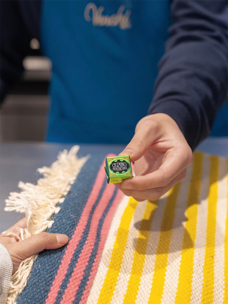 比如 Venchi 精选全球优质产地可可,保证了巧克力的浓郁纯正,还有被誉为“榛子中的皇后”的皮埃蒙特榛子、西西里岛布隆泰金字塔尖的开心果......每颗 Cremino 小方块都诉说着产地故事,也都成为了凝聚意大利风土与时间的艺术品。
