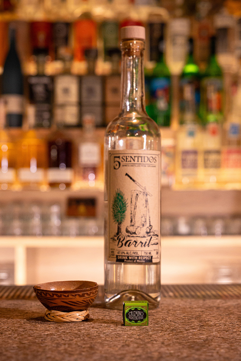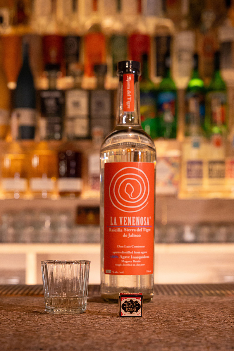 Cremino 扁桃仁酱榛子酱黑巧克力 & La Venenosa Sierra de Tigre 用了小批量生产的 La Venenosa 这款 Raicilla(一种龙舌兰蒸馏酒,Mezcal 的旁支),风味有白花、青苹果、溏心蛋与奶制品的发酵气息,甚至有淡淡的酸度和乳酪风味。