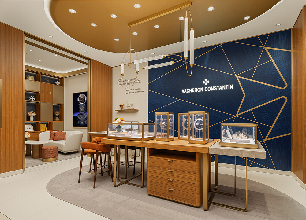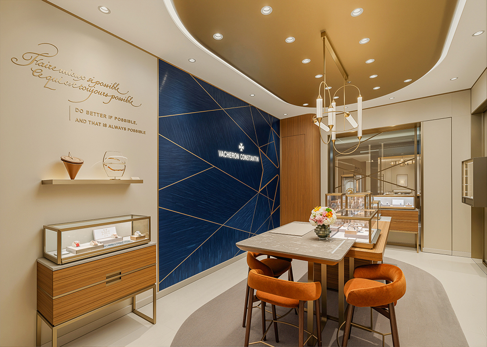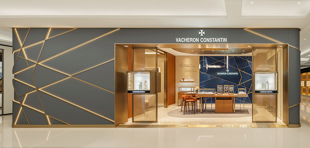 店铺整体用了雅致的浅金色调,同时有半透明玻璃墙面、棕色木质陈列柜搭配柔和的灯光与空间配色,当中集中展现了江诗丹顿的各种元素,灵感来自品牌标志性的“马耳他十字”设计更是在店铺内外完全覆盖,外立面的线条有着灵动的光芒,店内的蓝色背景墙上也同样以粗细不同的线条构成了马耳他十字几何形状。