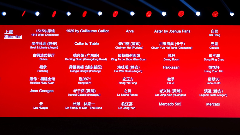 上海:壹零贰小馆、8 1/2 Otto e Mezzo Bombana、菁禧荟(长宁)、宝丽轩(上海宝格丽酒店)、喜粤 8 号(黄浦)、Da Vittorio、福和慧、御宝轩、吉品轩、唐阁(上海新天地朗廷酒店)、头灶、荣府宴