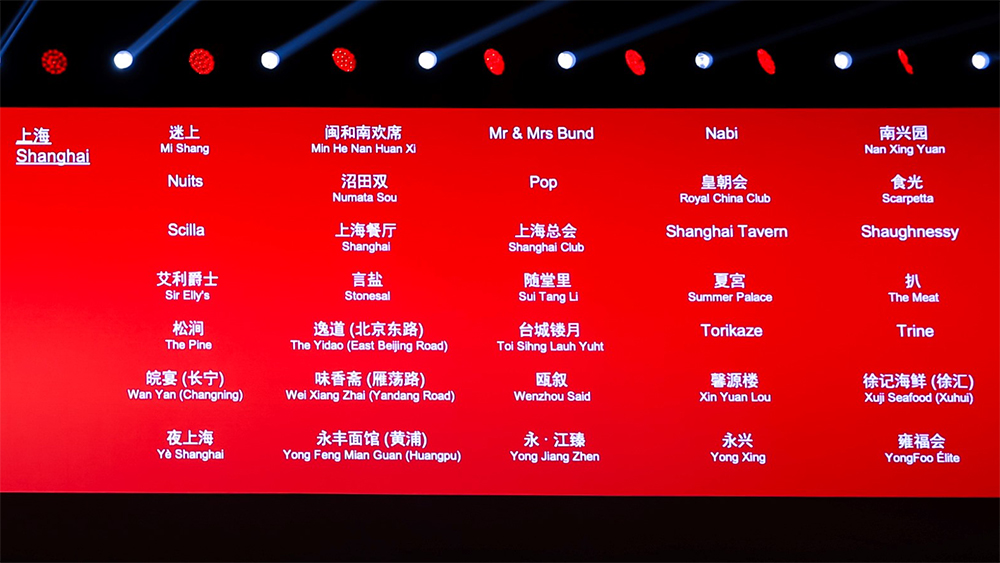 上海:三号黄埔会、成隆行蟹王府(黄浦)、大董(徐汇)、Fabula、福一零一五、福一零三九、福一零八八、美·大董、三月醉淮扬(静安)、Il Ristorante - Niko Romito(上海宝格丽酒店)、金轩(上海浦东丽思卡尔顿酒店)、老正兴、Le Comptoir de Pierre Gagnaire(上海建业里嘉佩乐酒店)、利苑(浦东新区)、利苑(徐汇)、凌珑、鲁采(黄浦)、莱美露滋、遇外滩(中山东二路)、明阁(上海虹桥康得思酒店)、鹿园(长宁)、鹿园(浦东新区)、Narisawa、Obscura、东方景宴、人和馆(徐汇)、家全七福、晟永兴(黄浦)、景煊、Vivant by Johnny Pham、屋有鲜、新荣记(南京西路)、逸龙阁(上海半岛酒店)、甬府(虹口)、甬府(黄浦)、雍颐庭(上海浦东文华东方酒店)、粤海棠、周舍(闵行)